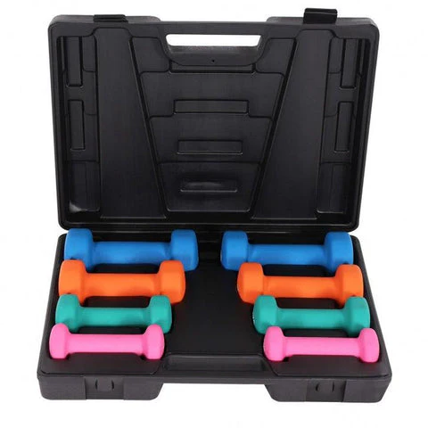 Den grå väskan rymmer fyra par hantlar i olika storlekar och viktklasser som redan ingår i setet. Varje färgglad hantel motsvarar en vikt mellan 0,5 och 2 kilogram. Med detta set sparar du plats och håller samtidigt ordning. Du kan snabbt ta med dig utrustningen om du till exempel vill träna med vänner eller utomhus.