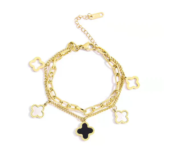 Alia Fyrklöver Armband är en fängslande smycke med en dubbel kedja dekorerad med flera hängen i form av fyrklöver. Den dubbla kedjan lägger till en delikat dimension till smycket, medan fyrklöverhängen symboliserar tur och välgång.
