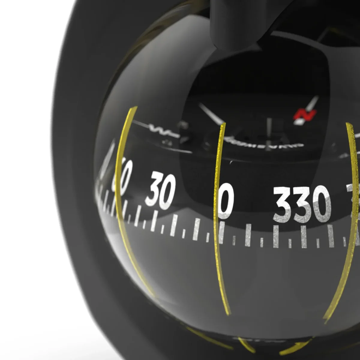 Med den främre krängningsskalan håller du enkelt reda på krängningsvinkeln. Kompassen har också inbyggd röd belysning som underlättar nattnavigering. De kardanupphängda styrstrecken förblir vertikala även om båten kränger (max 45°). De två extra styrstrecken med vid 45° medger avläsning från relingen eller en montering på annan plats än styrpositionen.