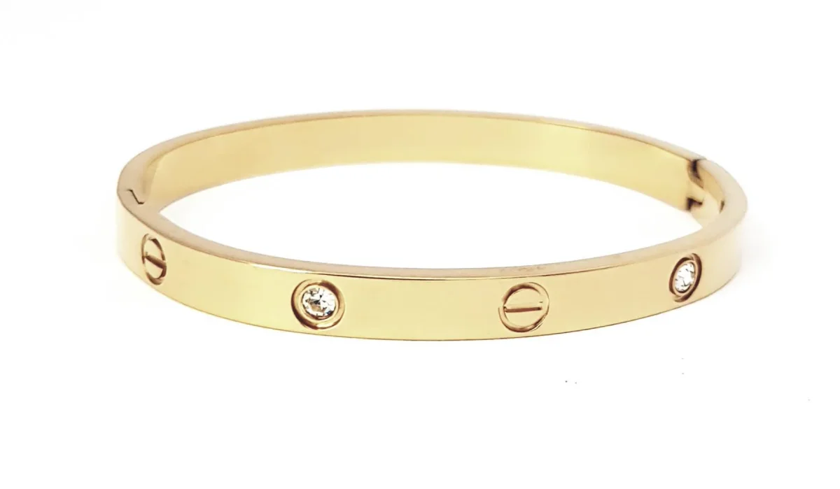 Chloé Bangle är ett elegant armband i guldfärg med en modern och tidlös design. De infällda, gnistrande stenarna ger armbandet en subtil lyxkänsla, medan de dekorativa skruvdetaljerna tillför en touch av karaktär och styrka.