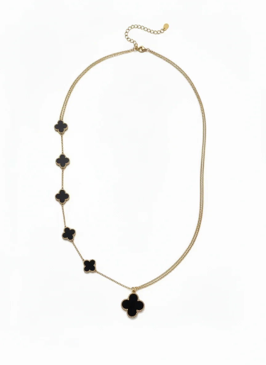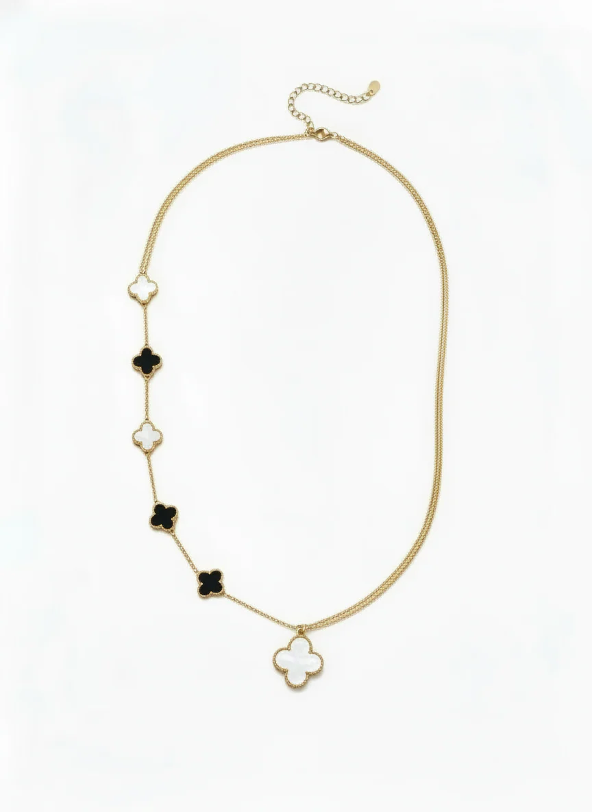 Detta vackra halsband kombinerar en tunn guldfärgad kedja med fem dekorativa fyrklöverhängen i svart och vitt. Den asymmetriska designen ger ett modernt och lyxigt uttryck, samtidigt som clover-motivet symboliserar tur och harmoni. Ett tidlöst smycke som passar perfekt både till vardag och fest.