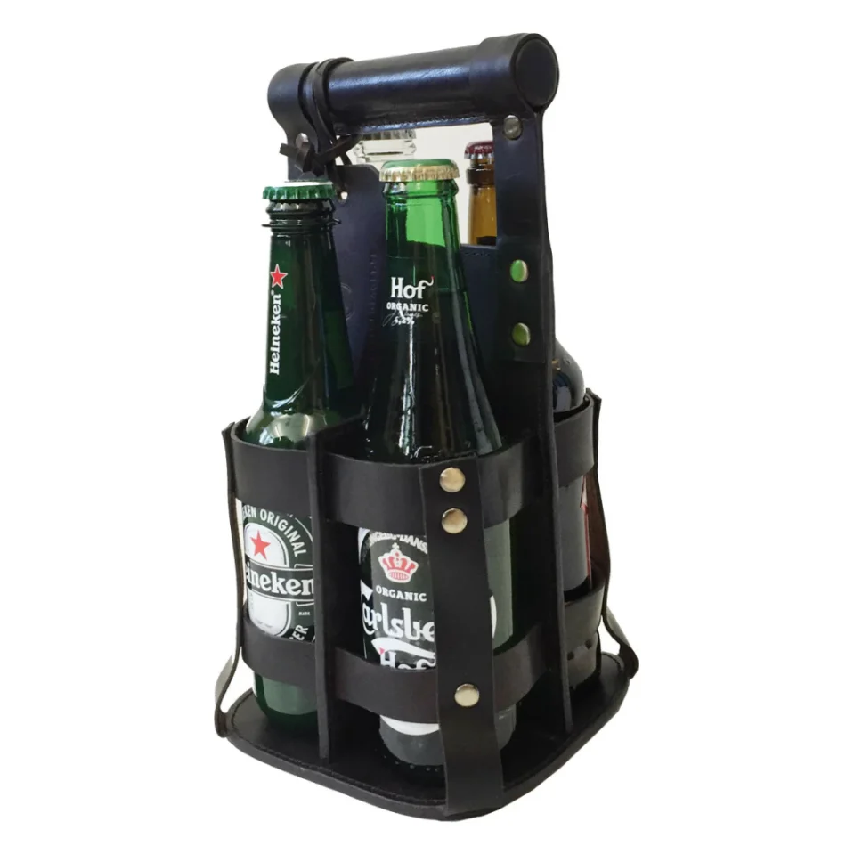 Dryckeshållare i skinn för fyra flaskor – ölflaskhållare