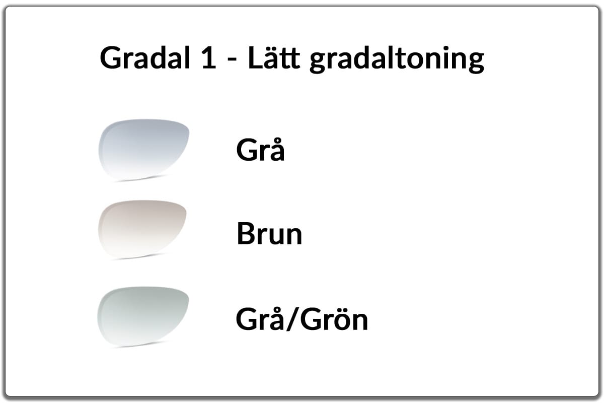 Välj färg samt om du vill ha en lätt toning (gradal 1) eller en mörkare toning för solglas (gradal 3).