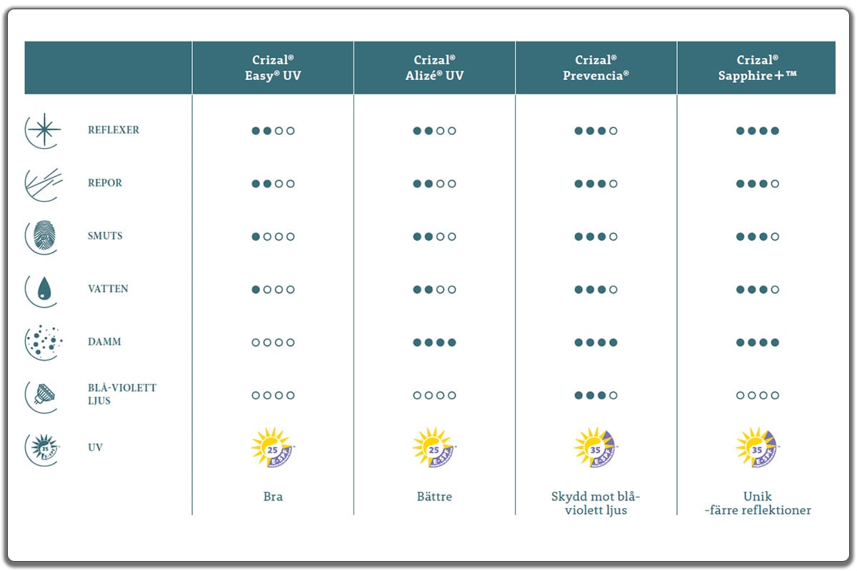 Den bästa ytbehandlingen Crizal Sapphire+ som är marknadsledande i branschen ingår.