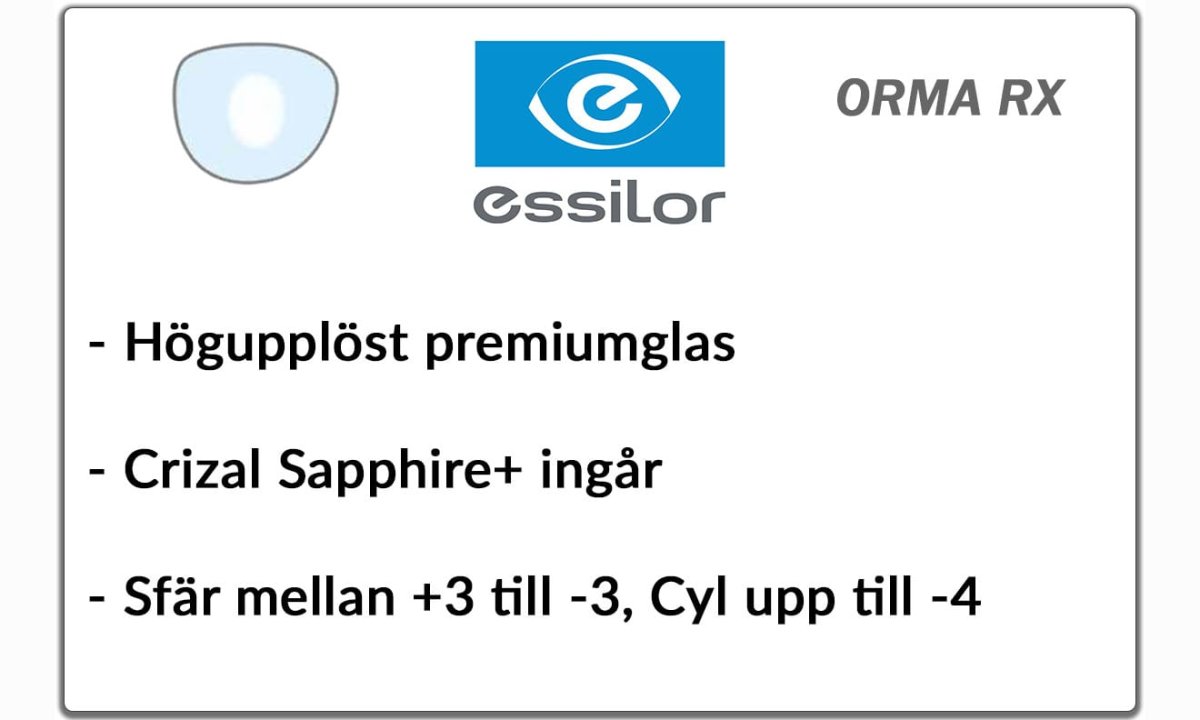 Essilor Orma 1.5 RX är ett högupplöst premiumglas. RX glaset specialbeställs vid högre cylindervärde, i övrigt samma som Orma 1,5.