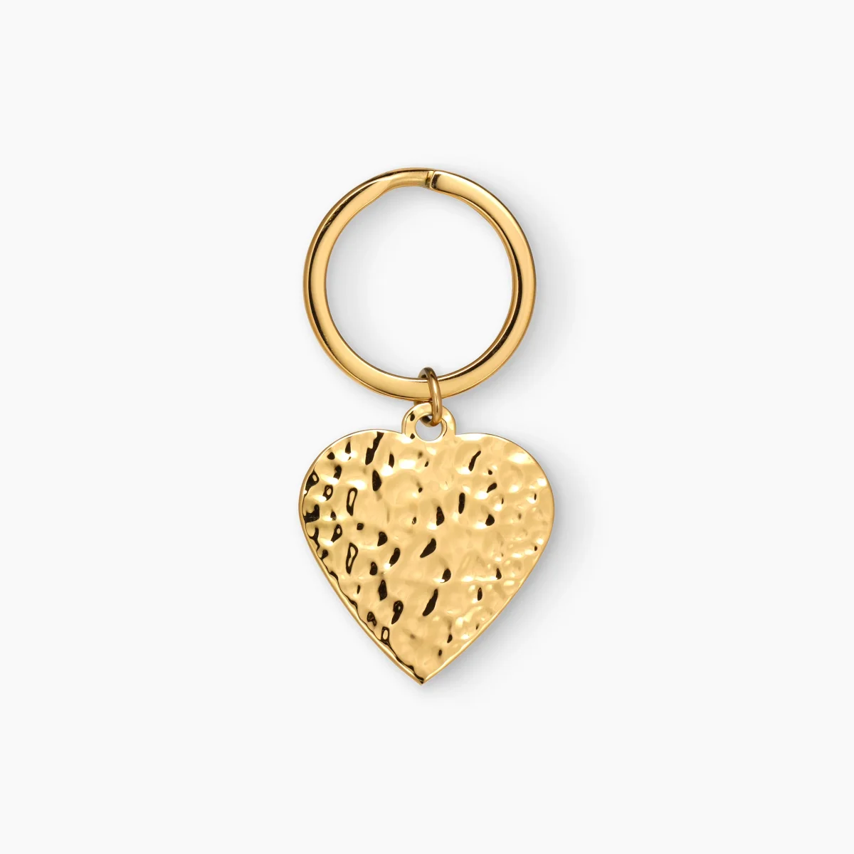 Hjärt nyckelring i vacker och stilren hamrad design. Nyckelringen är gjord av rostfritt stål och förgyllt med 18k guld. Du kan gravera upp till 3 rader text på baksidan av nyckelringen.