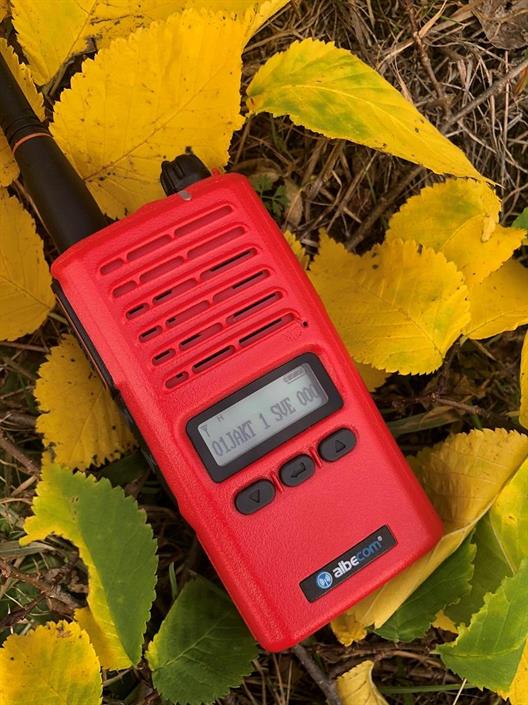 Jaktradio Albecom Albe-X5. 140/155mhz, Röd front med svarta tangenter, Vikt 250 g.r inkl. 2600 mA Litium Batteri