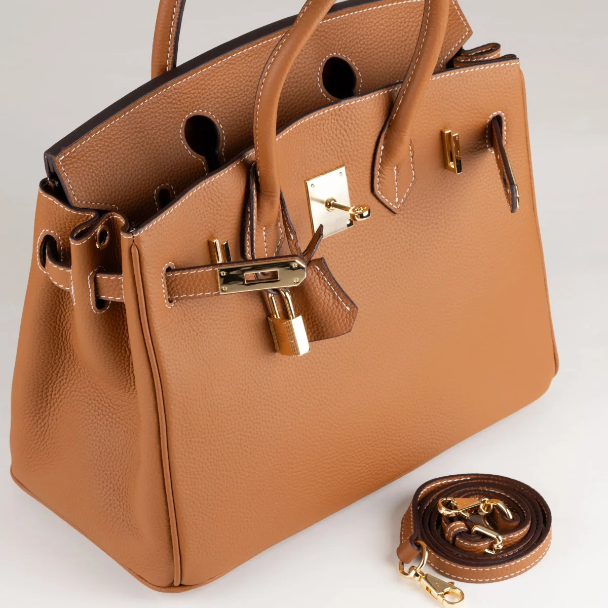 Elegant väska i skinn med guldfärgade detaljer och ikoniskt hänglås. Insidan har två fickor, varav en med dragkedja, perfekt för organisering. Med den avtagbara crossbody-remmen kan den bäras både över axeln och i handen för olika stilar.