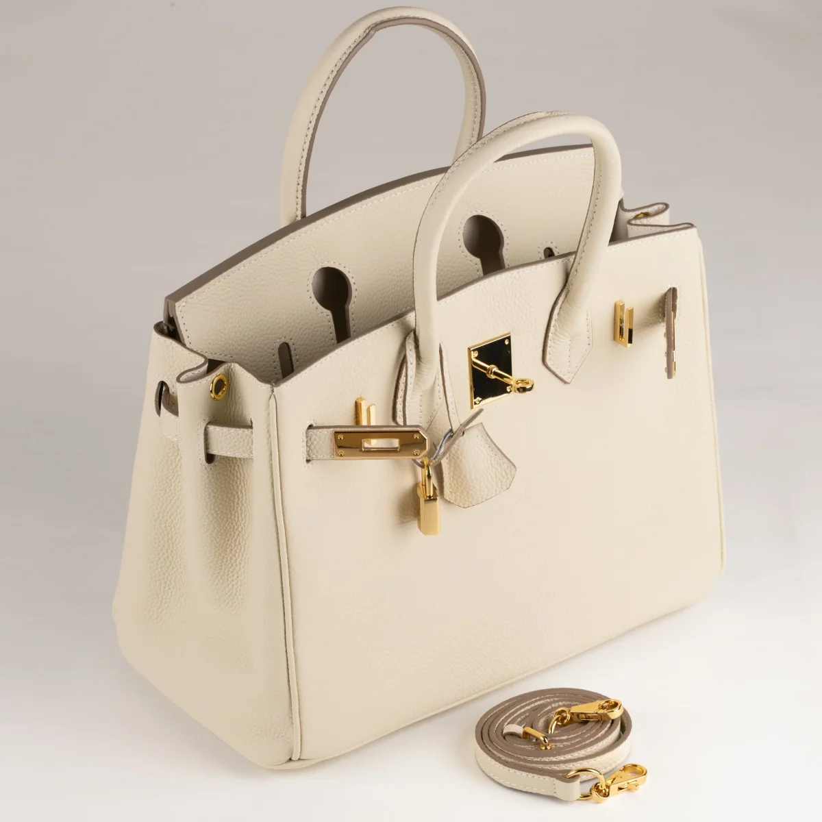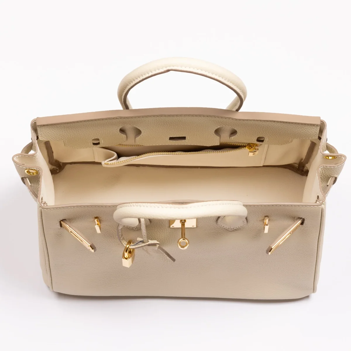 Elegant väska i skinn med guldfärgade detaljer och ikoniskt hänglås. Insidan har två fickor, varav en med dragkedja, perfekt för organisering. Med den avtagbara crossbody-remmen kan den bäras både över axeln och i handen för olika stilar.