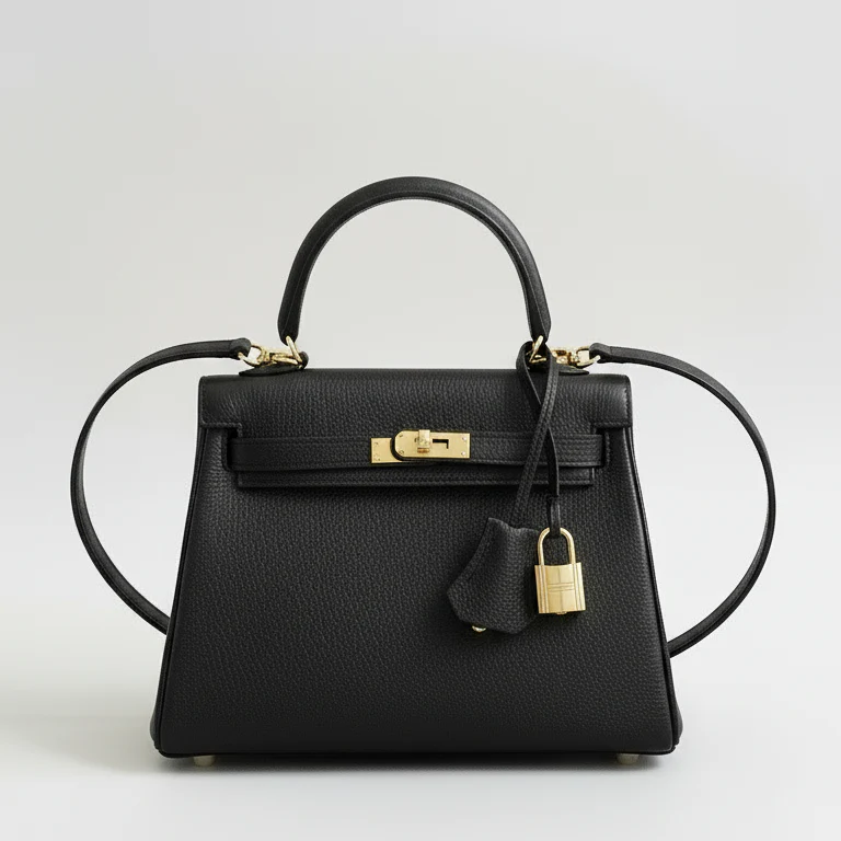 Elegant handväska i äkta skinn med klassisk design och guldtonade detaljer. Väskan har en insida i skinn med två innerfickor – varav en med dragkedja för säker förvaring. Levereras med avtagbar axelrem, hänglås och nyckel.