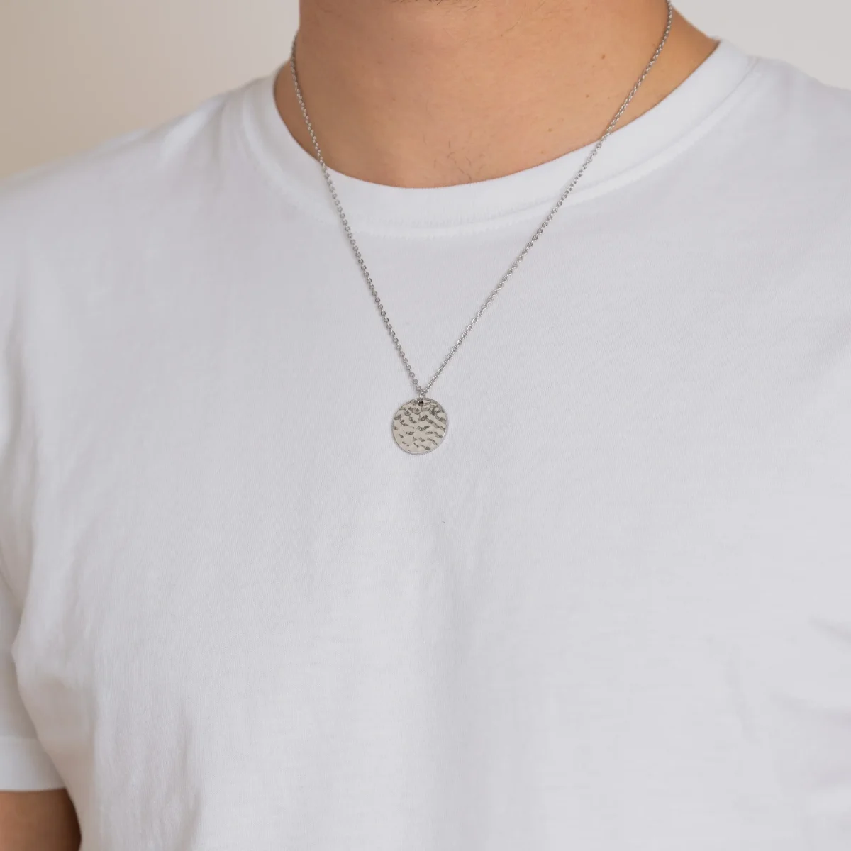 Ett snyggt och stilrent halsband till honom med personlig gravyr på baksidan av ett ovalformat hänge i hamrad finish.