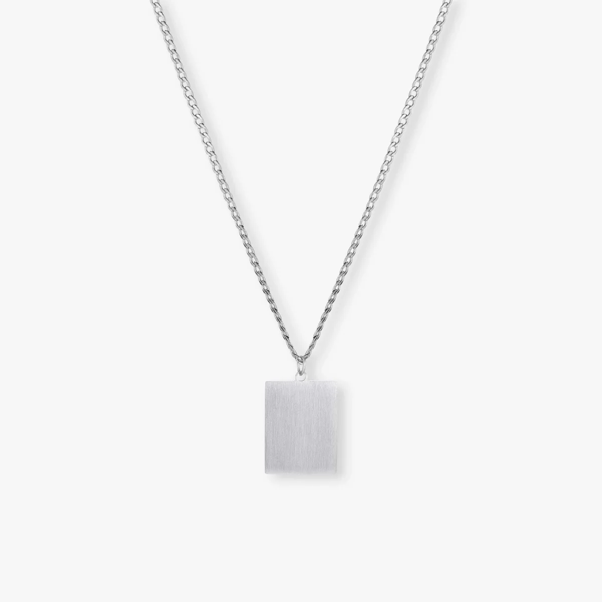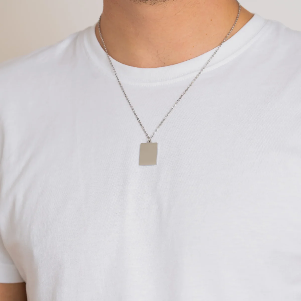 Ett snyggt och stilrent halsband till honom med personlig gravyr på baksidan av ett fyrkantigt hänge i robust finish.