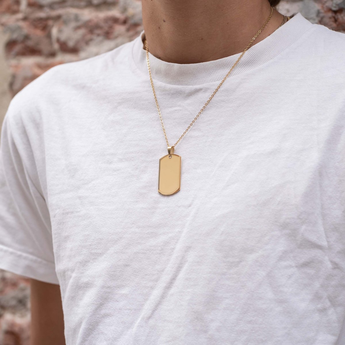 Ett snyggt och stilrent halsband till honom med personlig gravyr på baksidan av ett fyrkantigt hänge i robust finish. Halsbandet är förgylld med 18 karats guld.