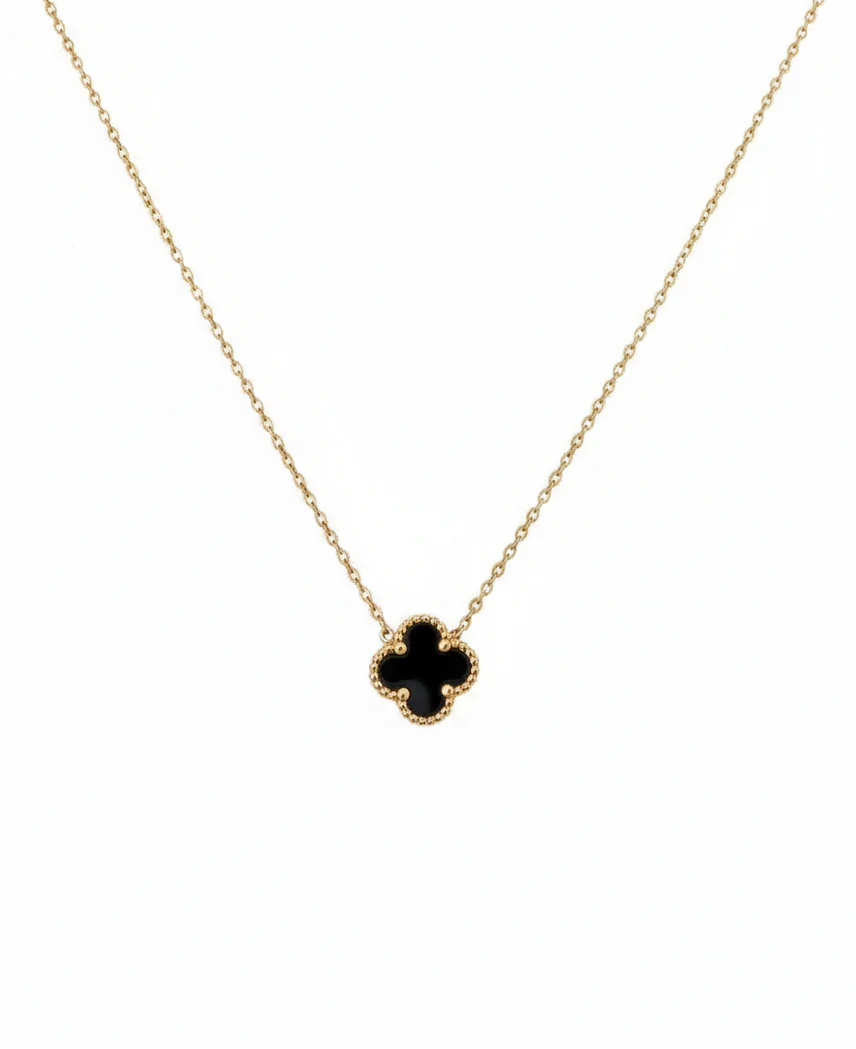 Elegant halsband i guldfärgat rostfritt stål med ett vackert fyrklöverformat hänge i svart emalj. Den tunna, glänsande kedjan ger ett lätt och sofistikerat uttryck som passar perfekt både till vardags och fest. Halsbandet symboliserar tur och harmoni – en tidlös detalj som lyfter varje outfit.