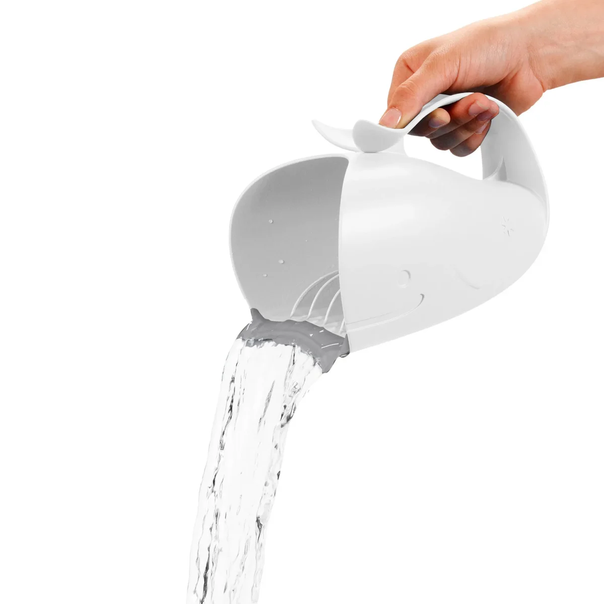 Du håller den mjuka öppningen mot barnens panna för att skölja bort schampot. Kannans handtag gör det lätt att hälla med ena handen och hålla barnets huvud med den andra. Kannan har kanaler som gör att vattnet rinner i en kontrollerad ström, för att undvika att det kommer skum i ögonen.