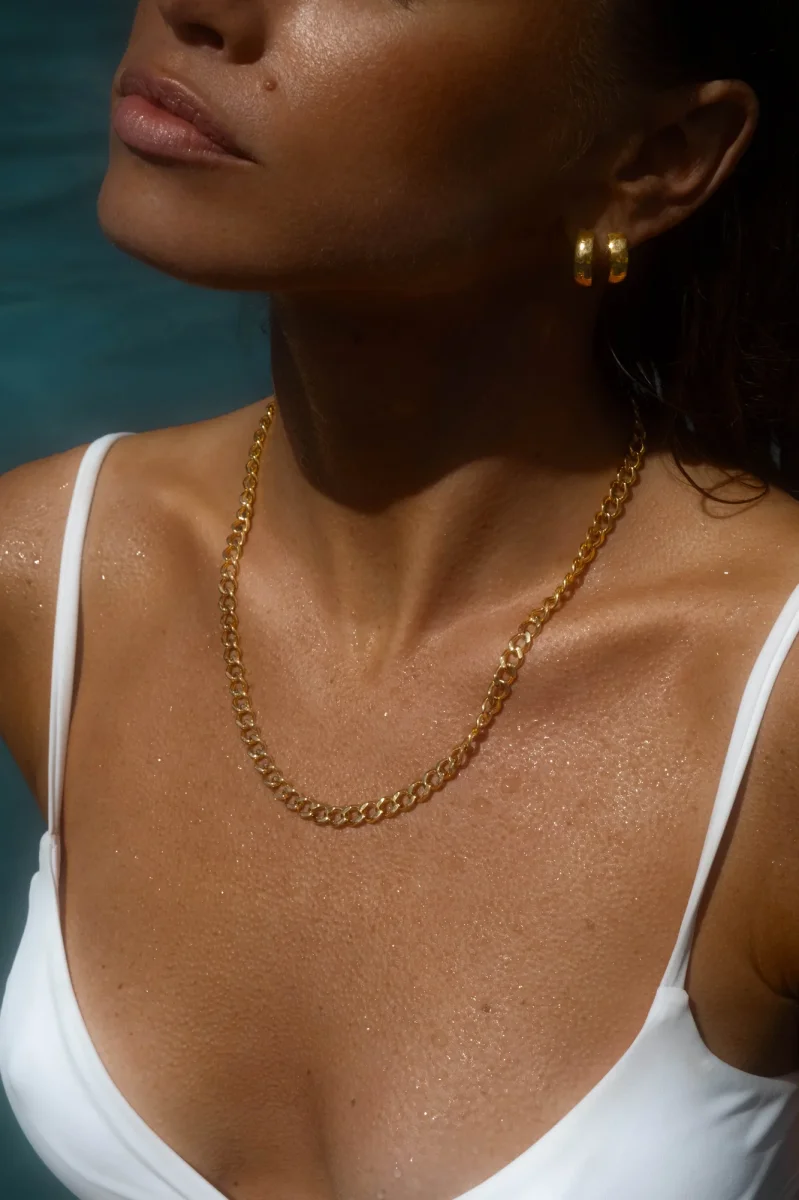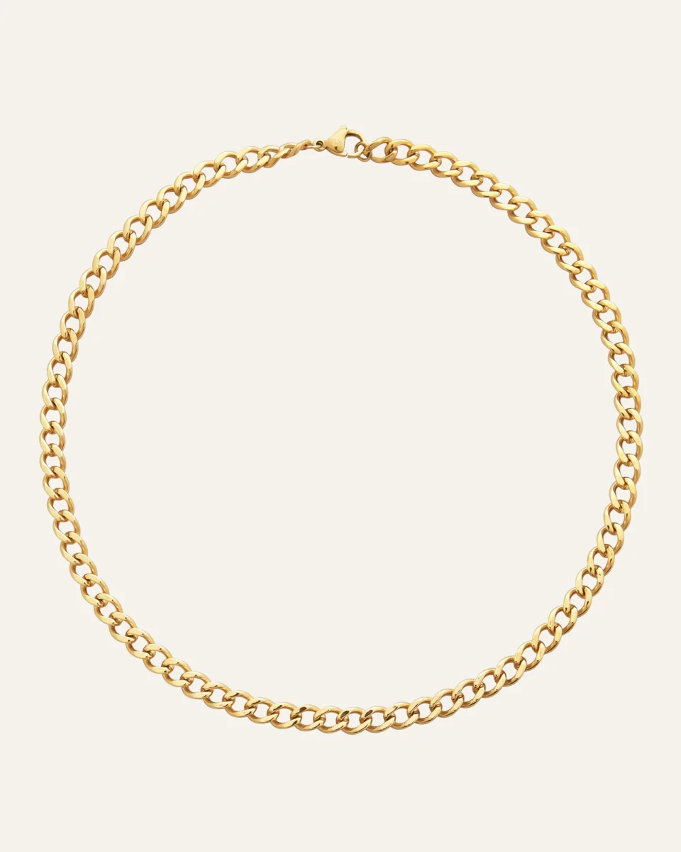 Det här halsbandet kommer lyfta alla dina outfits. Kedjan är tillverkad i massivt rostfritt stål som sedan har en 18K guld PVD-beläggning vilket gör den mycket slitstark och dessutom vattentålig. Bada, duscha och träna i detta smycke utan att oroa dig för att det ska tappa färg. Förlängningskedjan går att ta av om man önskar.