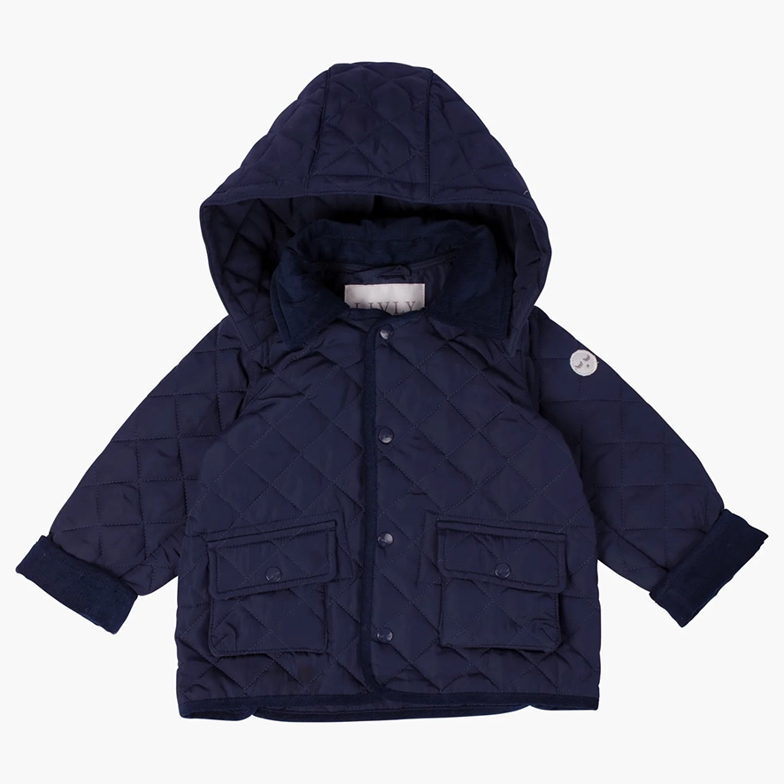 Quilted jacket är här i en härlig navy ton! Med avtagbar luva, LIVLY knappar i fram, och med krage och muddar i manchester, kan vi inte tänka oss en mysigare (eller finare) jacka till våren!