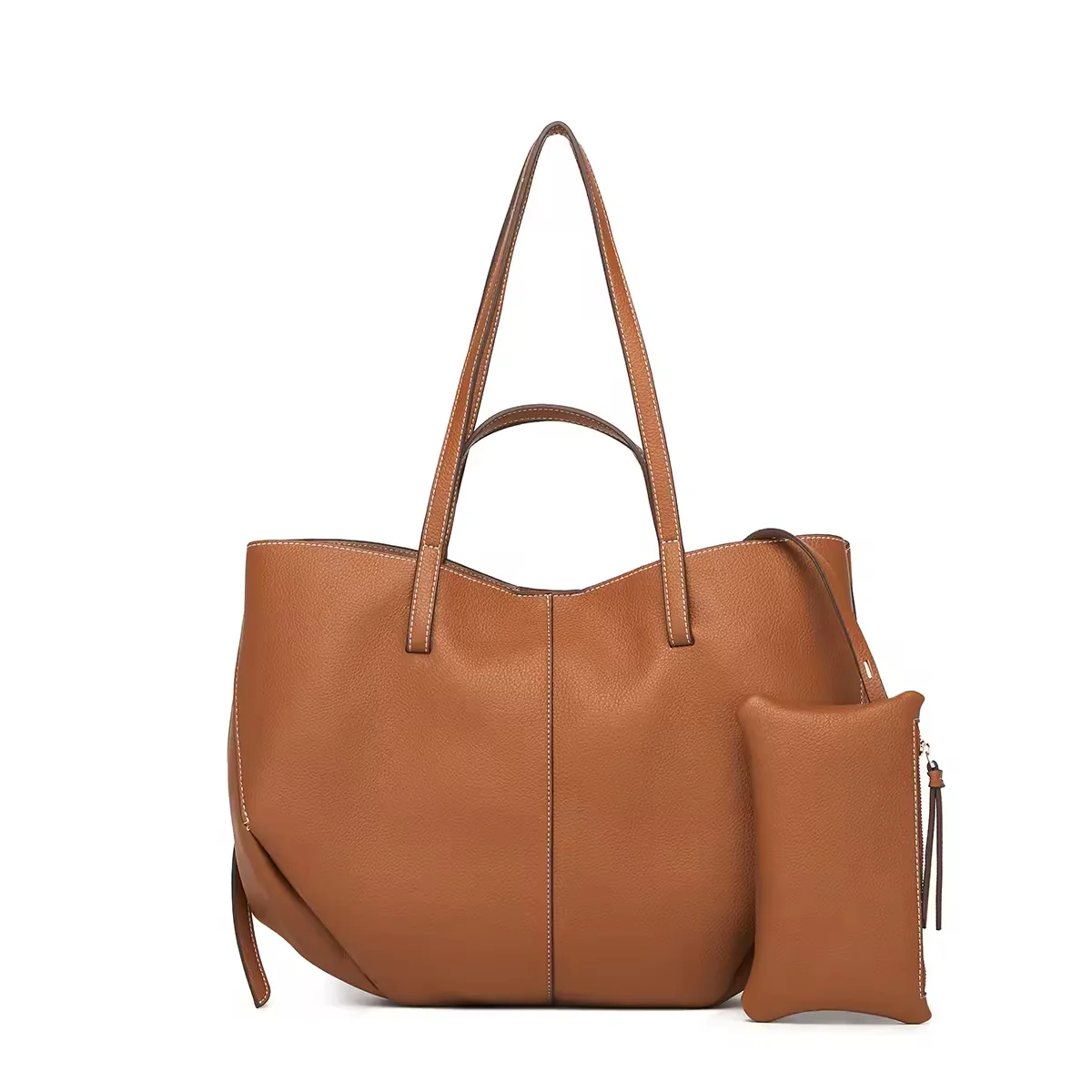 Stor handväska i läder med mångsidiga bäralternativ: utrustad med två korta handtag för att bäras som handväska samt två längre remmar för användning som axelväska. Inkluderar en praktisk avtagbar förvaringsplånbok med dragkedja, perfekt för att hålla småsaker organiserade och säkra. Väskan stängs enkelt och säkert med en magnetknapp, vilket gör den idealisk för den moderna, aktiva kvinnan.