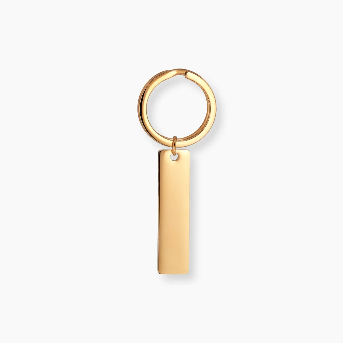 Nyckelring i vacker och stilren design. Nyckelringen är gjord av rostfritt stål förgyllt med 18K guld. Du kan gravera upp till 3 rader text på nyckelringen.