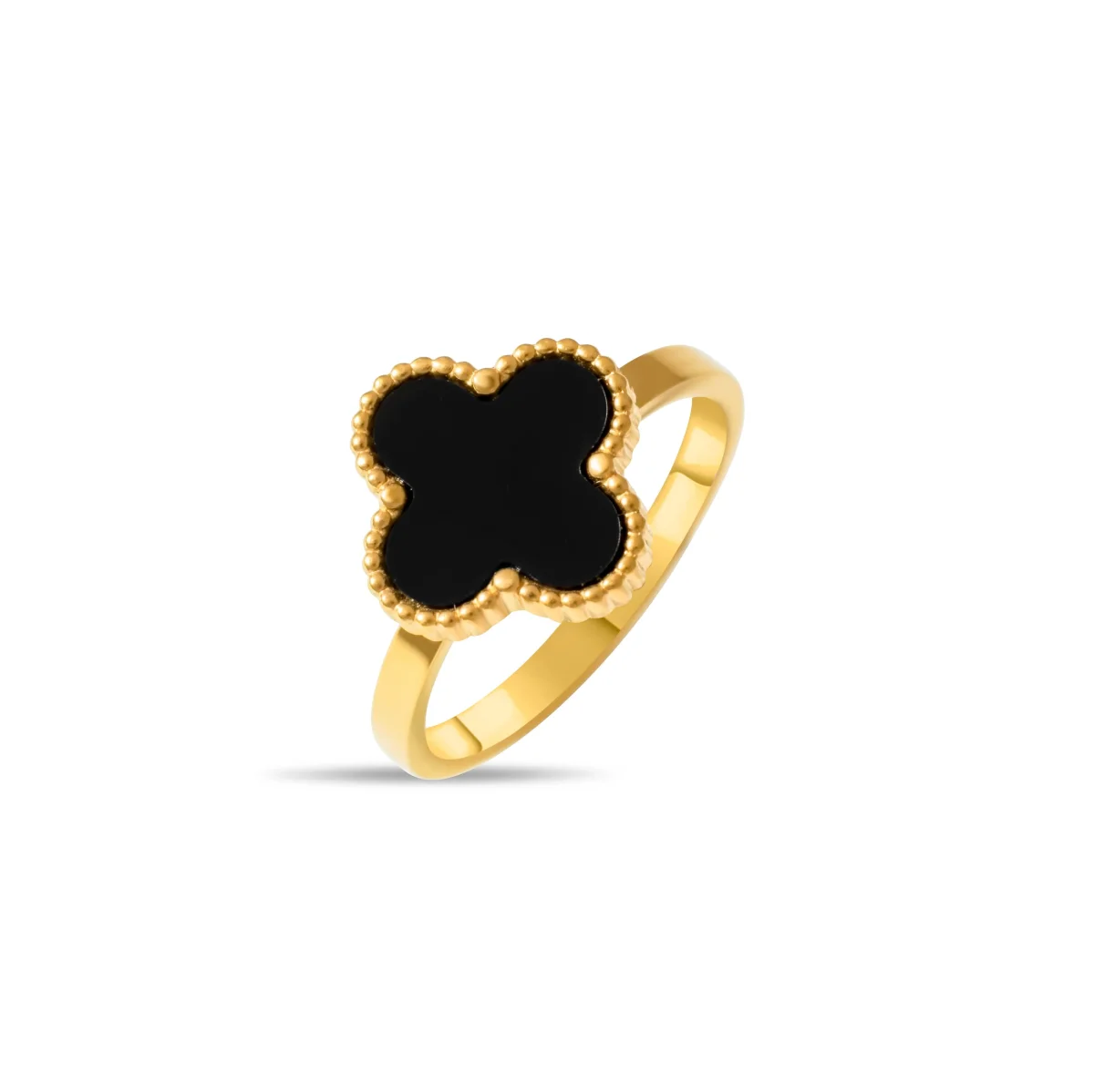 En stilren ring i guldfärg med ett vackert klövermotiv ovanpå. Klövern symboliserar lycka och ger ringen en tidlös känsla. Den guldfärgade finishen gör den elegant och passar lika bra till vardags som vid speciella tillfällen.