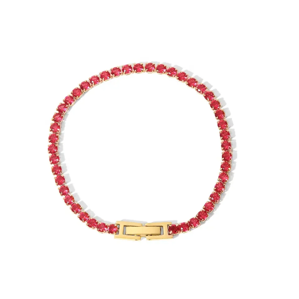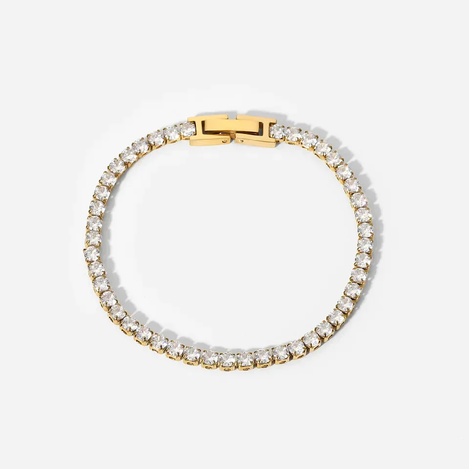 Detta bracelet i guldpläterad design med stenar är en perfekt accessoar för speciella tillfällen som bröllop, bal eller andra festliga evenemang, men kan också användas som en glamorös vardagsaccessoar.