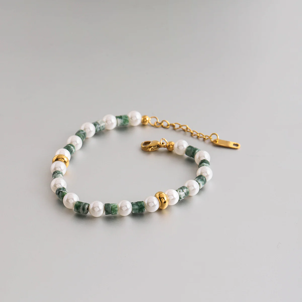 Sötvattenspärla med grön jaspis och pärlemor – Ett elegant smycke som kombinerar pärlemorns lyster, pärlans mjukhet och den gröna jaspisens djup. Ett raffinerat smycke som förenar äkthet och finess.