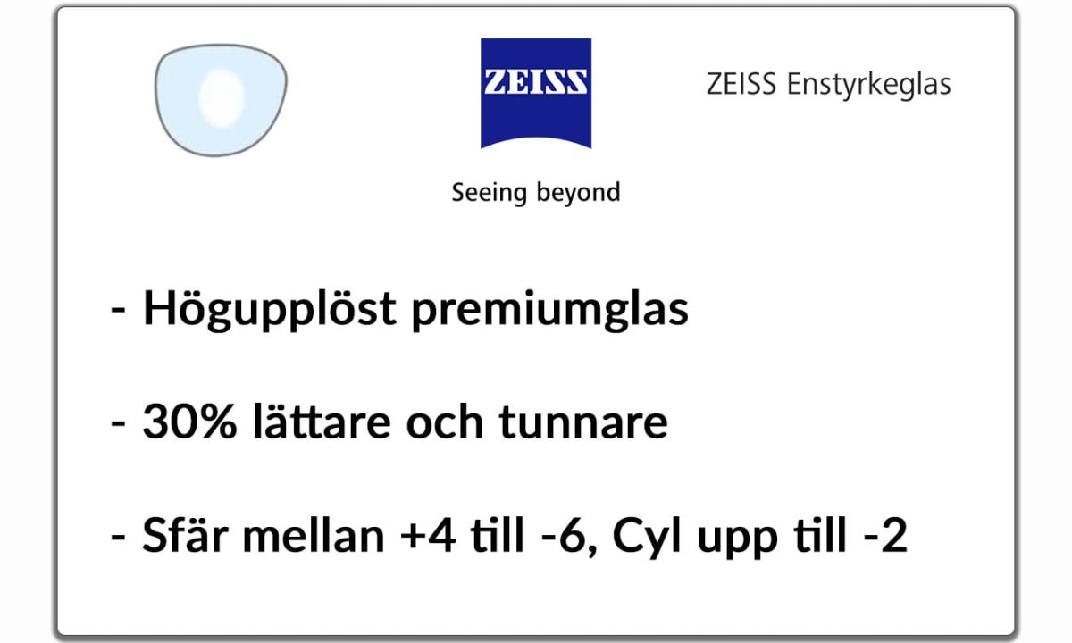 Enstyrkeglas är glas med endast en dioptrisk styrka, som används för att korrigera närsynthet eller översynthet. Optimal optisk prestanda, ett attraktivt utseende och högsta möjliga användarkomfort var utgångspunkten när vi skapade ZEISS Single Vision Sph – tunna och lätta glas, som ger dig bekväm och knivskarp syn hela dagen. Alla glas från ZEISS har fullt skydd mot UV-strålning upp till 400 nm.
